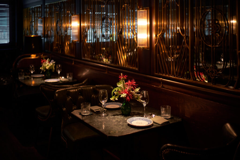 • The third-floor salon, inspired by French romanticism, features leather armchairs, marbled tables, and moody lighting for an elevated experience.