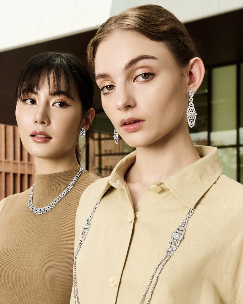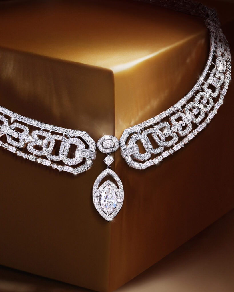 สร้อยคอชิ้นเอกที่ถูกสร้างด้วยรูปทรงแบบปกคอเสื้อ ที่ต้องสร้างสร้อยคอให้มีโครงสร้างที่ต้องบาลานซ์ระหว่างความแข็งเพื่อให้สร้อยคอตั้งเป็นทรงและความพริ้วไหวเพื่อให้รับกับสรีระของผู้สวมใส่ ถูกประดับด้วยเพชรทรง มาร์คีส์, บาแกตต์ และเอเมอรัลด์คัต เจียระไนงดงาม เพื่อให้ทุกเหลี่ยมมุมของเพชรส่องประกายได้ทุกองศา เผยเทคนิคการฝังเพชรแบบ Pave Setting อันแสดงถึงงานฝีมือขั้นสูงที่ถ่ายทอดออกมาได้อย่างสง่างาม เหนือกาลเวลา น่าค้นหา และเหมาะสมกับทุกช่วงโอกาส