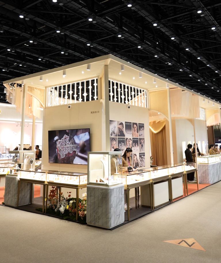 หนึ่งในไฮไลท์ที่ดึงดูดสายตาภายในงาน คือดีไซน์บูทของ เดอมอนด์ ณ บริเวณ Prestige Zone ซึ่งนำเสนอแนวคิดการออกแบบแบบ 360 องศา ถ่ายทอดตัวตนในฐานะ Thai Global Fine Jewelry House ได้อย่างลึกซึ้ง และน่าประทับใจเริ่มต้นที่บริเวณฟาซาด ส่องประกายความอบอุ่นผ่านแสงทองของ สตาร์โมทิฟ สัญลักษณ์ประจำเฮาส์แบรนด์ที่สืบทอดมากว่า 33 ปี สะท้อนออกไปทั่วบริเวณภายในงาน ดังแสงทองแห่งการต้อนรับแขกผู้มาเยือนไว้อย่างสง่างามและเปี่ยมไว้ด้วยความหมาย เชื่อมต่อมิติการออกแบบผ่านชั้นบรรยากาศของพื้นที่ด้วย ผ้าม่านทอพลิ้วไหว สร้างความรู้สึกโปร่ง โล่ง สอดประสานพื้นที่กับความว่างเปล่าไว้ได้อย่างกลมกลืน เปรียบดังบทกวีแห่งสถาปัตย์ที่ผสานความสงบและความเคลื่อนไหวเอาไว้ด้วยกันอย่างลงตัว เชิดชูงานสานหัตถศิลป์ท้องถิ่นจากผนังไม้สาน ที่ถูกนำมาประยุกต์ใช้เป็นองค์ประกอบ ถ่ายทอดกลิ่นอายงานหัตถกรรมไทยเดิม เสมือนบ้านที่เต็มไปด้วยเรื่องราวสะท้อนความอบอุ่นและความพิถีพิถันในรายละเอียด โอบล้อมพื้นที่การจัดงาน ด้วยมวลหมู่ดอกไม้นานาพรรณ ไล่เฉดสีเอาไว้อย่างประณีตรอบบริเวณตลอดพื้นที่แบบ 360 องศา เพิ่มมิติแห่งความเรืองรองและชีวิตชีวา สื่อถึงความสมดุลของสีสัน และความคิดสร้างสรรค์ของทีมงาน เดอมอนด์ ทุกคนที่ร่วมเนรมิตบรรยากาศภายในงานให้กลายเป็นพื้นที่แห่งศิลปะ เครื่องประดับ และวัฒนธรรมอย่างแท้จริง ส่งมอบประสบการณ์การเยี่ยมชมที่ตราตรึง ทั้งต่อชาวไทยและผู้มาเยือนจากทั่วโลก ให้ทุกก้าวย่างในดีไซน์บูทของ เดอมอนด์ คือการสัมผัสถึงมรดกแห่งงาน อัญมณณีวิจิตรศิลป์ ของชาติไว้อย่างแท้จริง