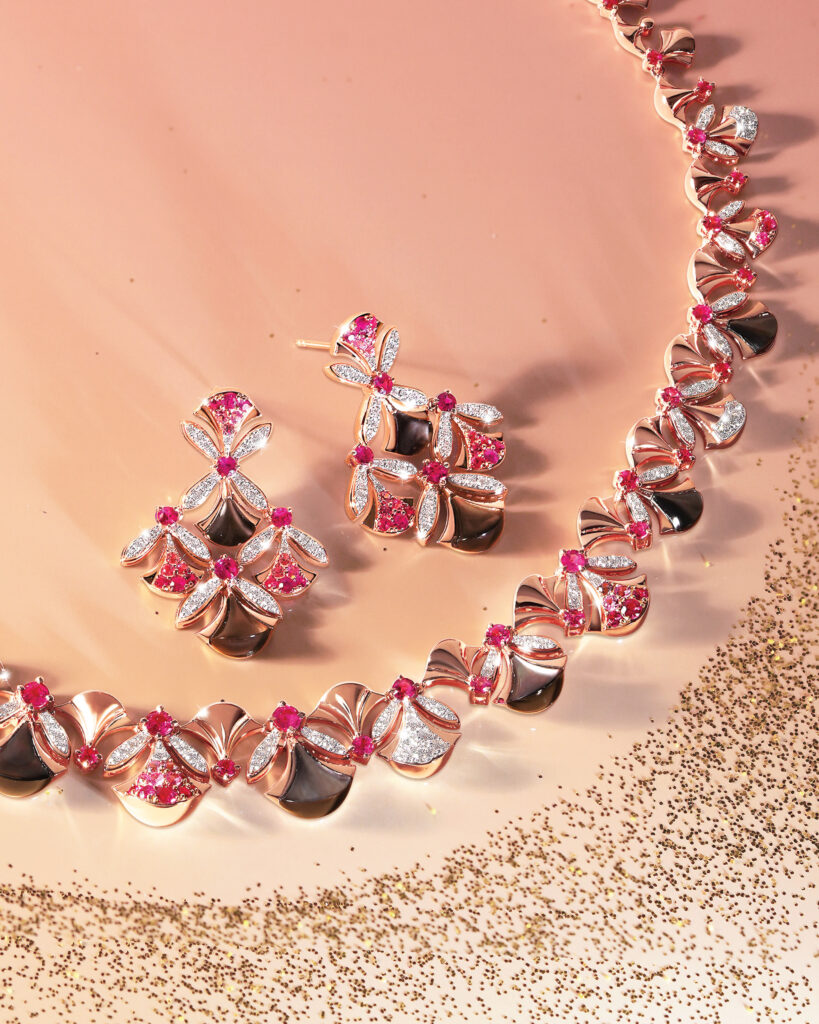 ประกอบด้วย ไพลิน (Sapphire), ไพลินสีชมพู (Pink Sapphire), มรกต (Emerald) และ เพชร (Diamond) ทุกดีไซน์ถูกสร้างสรรค์ขึ้นด้วยงานฝีมืออันประณีตและรายละเอียดที่พิถีพิถัน จนเกิดเป็นความกลมกลืนที่ไร้ที่ติ ผลลัพธ์คือผลงานที่สะท้อนทั้งความหรูหราและเอกลักษณ์อันโดดเด่น ถ่ายทอดความงามในทุกมิติ