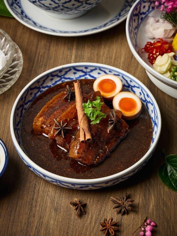 Geang Som Pla Kapong Yod Maprao showcases fresh golden snapper in rich Southern-style yellow curry with young coconut shoots, while Moo Hong presents the finest braised streaky pork, cooked to perfection in the traditional local style. Every lunch or dinner can then end with a delectable dessert of Kanom Hua Lan, glutinous rice dumplings in salted coconut sauce.