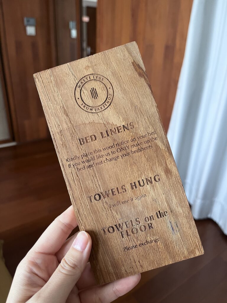 - Wooden eco-cards in guest rooms to minimize unnecessary laundry, encouraging mindful consumption.