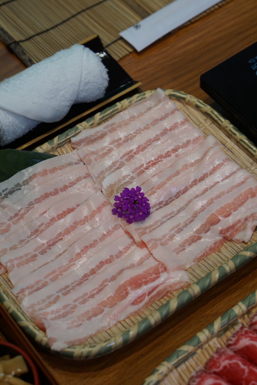 ในส่วนของเนื้อสัตว์ เชฟได้คัดสรรและสไลด์เนื้อให้มีความบางที่เหมาะสมกับการนำตะเกียบคีบลงไปแกว่งในน้ำซุปจนเกิดเสียง ชาบู ชาบู เนื้อหมูคุโรบุตะและอาหารทะเลถูกเลือกสรรในส่วนที่ดีที่สุดสำหรับหม้อไฟ ส่วนเนื้อวัวนั้น เชฟคัดสรรเนื้อนำเข้าที่มีไขมันและกลิ่นเนื้อที่เมื่อรับประทานคู่กับน้ำจิ้มและเครื่องเคียงต่างๆ จะได้สัมผัสชาบูหม้อไฟสไตล์ญี่ปุ่นอย่างแท้จริง