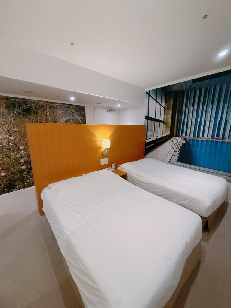 ツインルームは日本らしいミニマルなデザインが魅力。温かみのある木の質感と柔らかい照明が落ち着いた雰囲気をつくり、コンパクトながらも使いやすいレイアウトになっています。