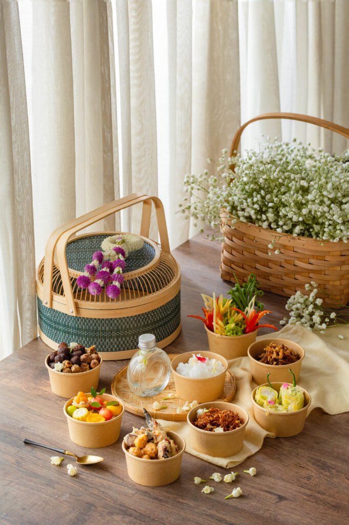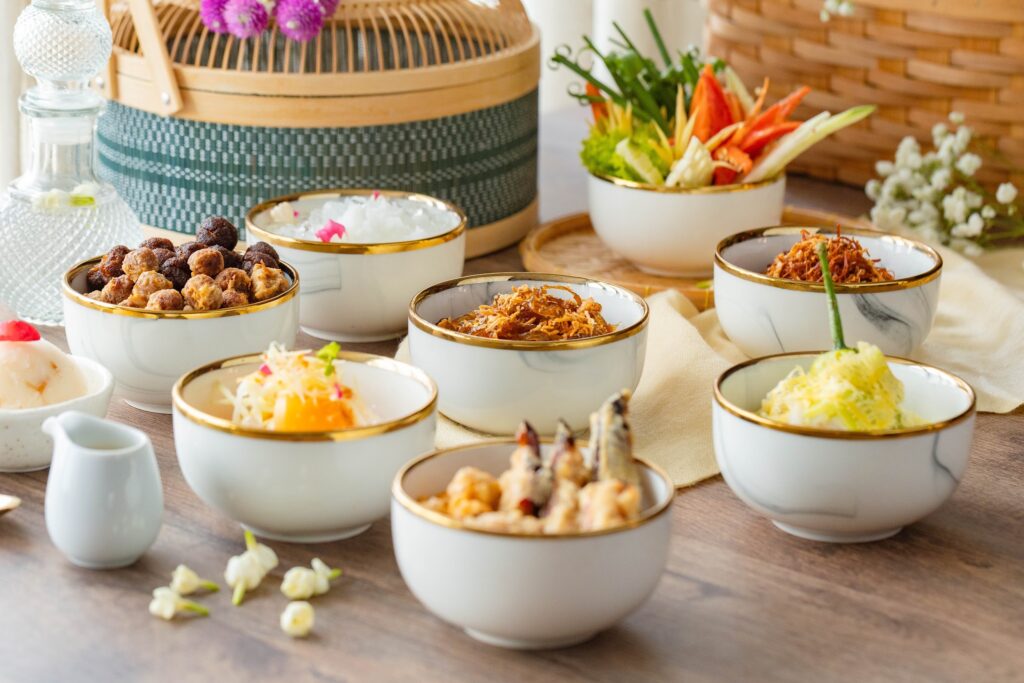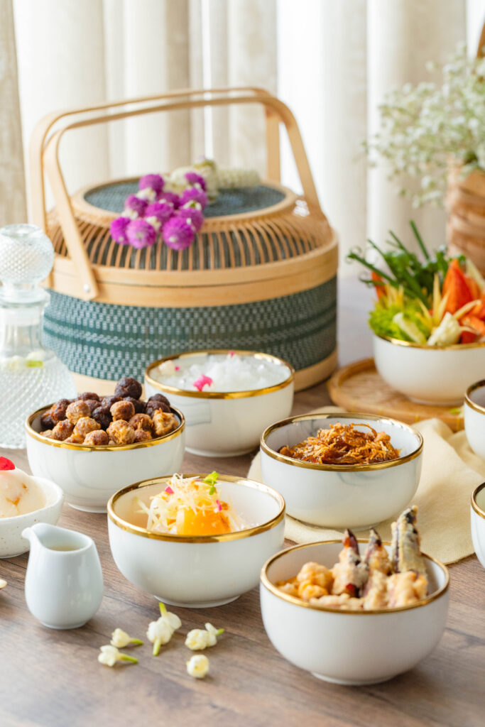 Signature highlights include deep-fried sea bass with shrimp paste ball, sweet freshwater fish glazed with palm sugar, crispy shredded pork, fried shallots stuffed with crab meat, caramelized Chinese radish, and succulent shrimps wrapped in delicate lacy egg. Guests may also savour a choice ofdeep-fried shredded pork or deep-fried shredded beef, complemented by freshly carved seasonal vegetables and green mango, lending a refreshing balance and refined harmony of flavours.