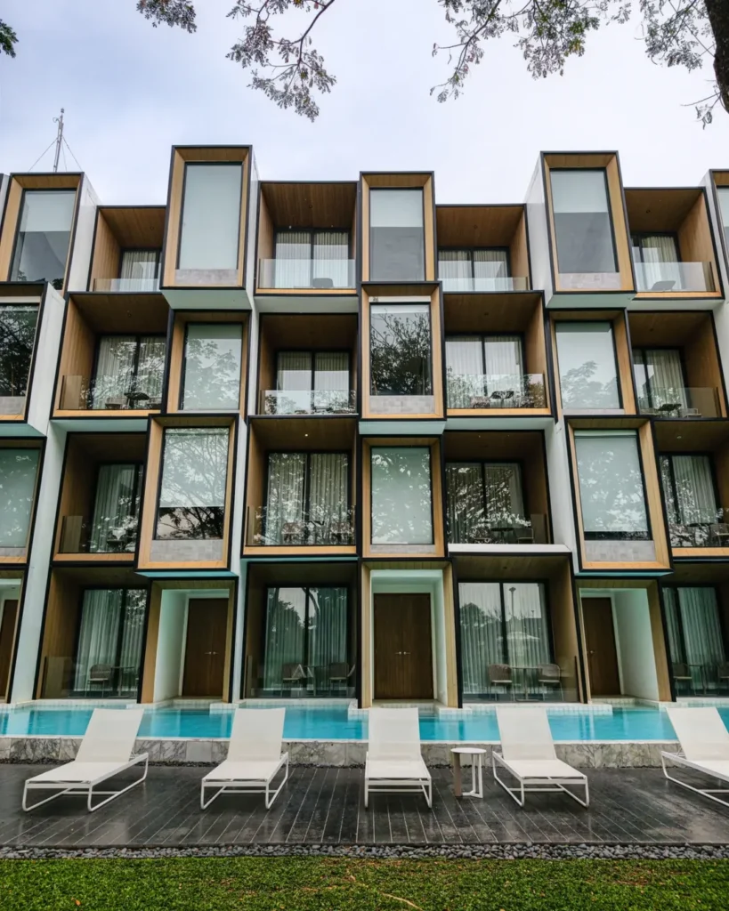 Yet despite its contemporary aesthetic, the resort never feels cold. Natural materials and greenery soften the structure, creating a seamless dialogue between architecture and environment.