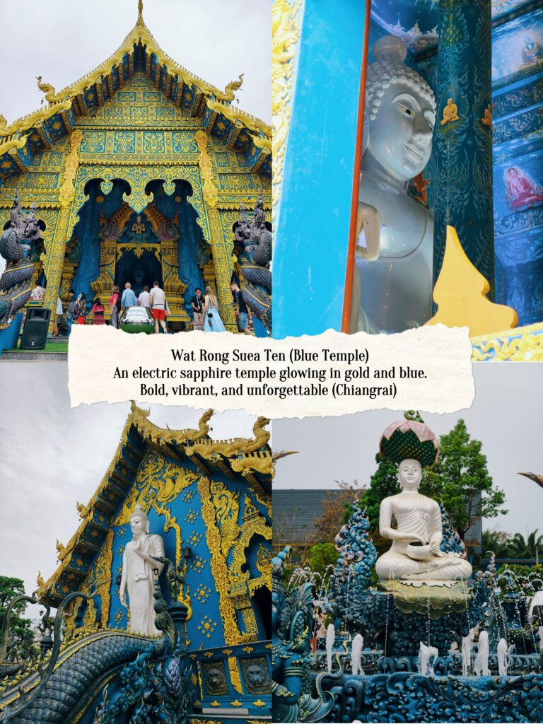 In contrast to the radiant white of Wat Rong Khun, Wat Rong Suea Ten captivates with rich sapphire tones and luminous gold accents. The temple’s intense color palette gives it a striking presence against the northern sky, making it feel both spiritual and theatrical. Inside, the atmosphere shifts into something more serene, with intricate details drawing the eye in every direction. It is one of Chiang Rai’s most visually memorable cultural landmarks.