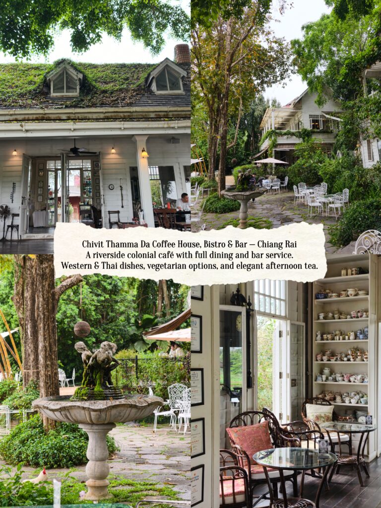 Overlooking the river in Chiang Rai, Chivit Thamma Da brings together old-world charm, garden beauty, and an unhurried pace. The atmosphere feels romantic and gently nostalgic, making it an ideal place for a long lunch, coffee break, or quiet afternoon by the water. With its elegant setting and refined details, it offers a softer, more lifestyle-oriented pause within the trip. It is easy to see why this riverside café remains one of Chiang Rai’s most beloved stops.