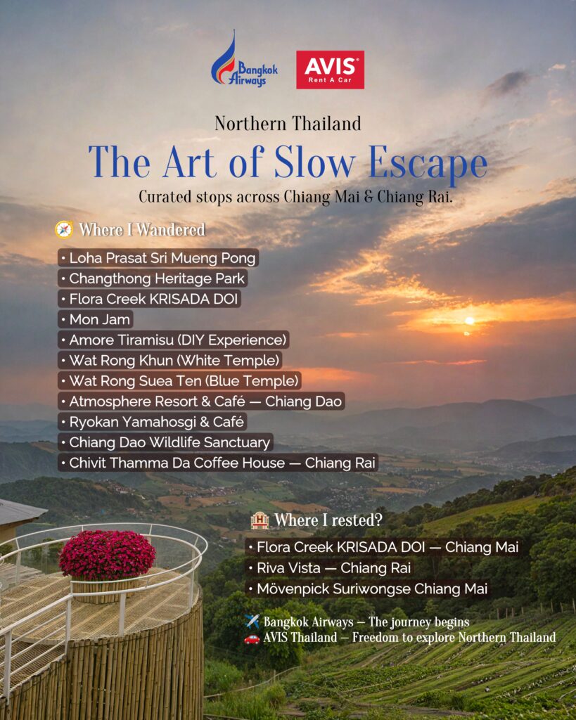 With the comfort of Bangkok Airways and the flexibility ofand AVIS Thailand, Northern Thailand revealed itself in the most rewarding way: slowly, beautifully, and at your own pace.